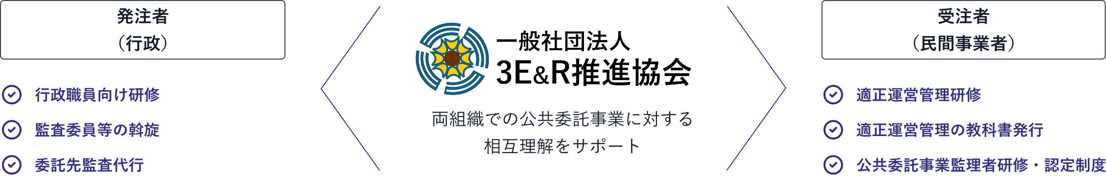 行政が実施する事業は、3E&R検査の観点を「常識」とする管理が必要。発注者も受注者も、同じ「常識」で適正な事業運営管理を行う為に、当法人は双方それぞれをサポートする支援組織です。